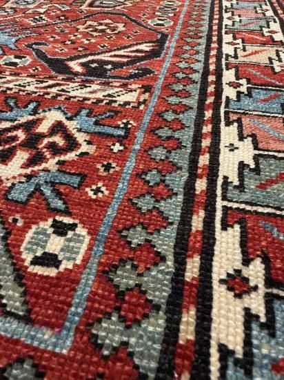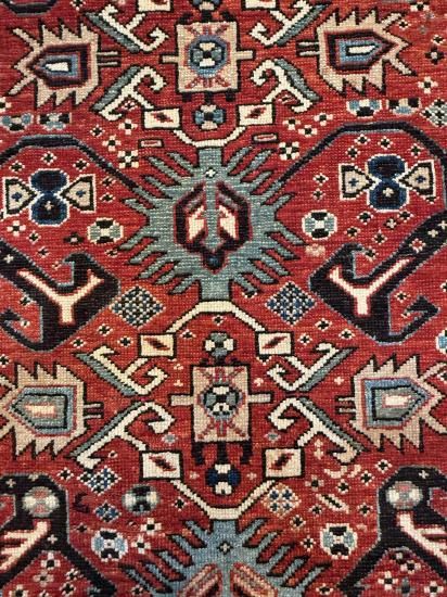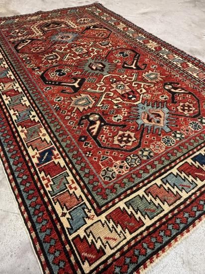 深みのある赤とブルーを基調とした幾何学模様が特徴で、状態はとても良く、しっかりとしたウール素材が使われています。