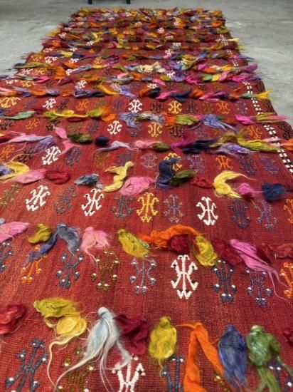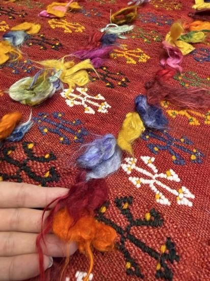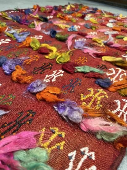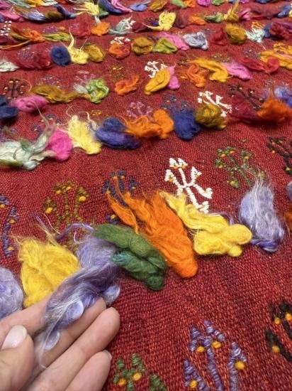 平織りのベースに、色鮮やかなウールの房(タフト)を手作業で結び付けた、立体感のある非常に個性的なテキスタイルです。