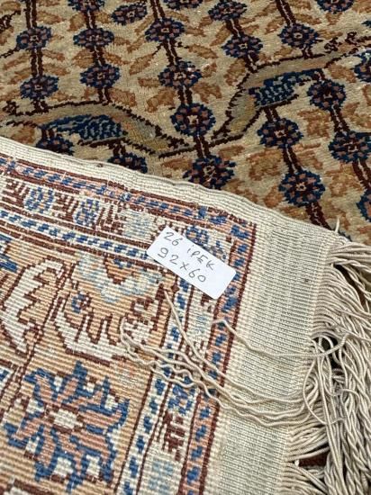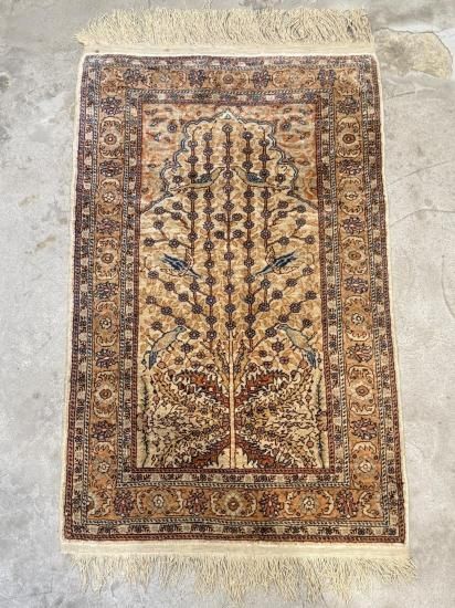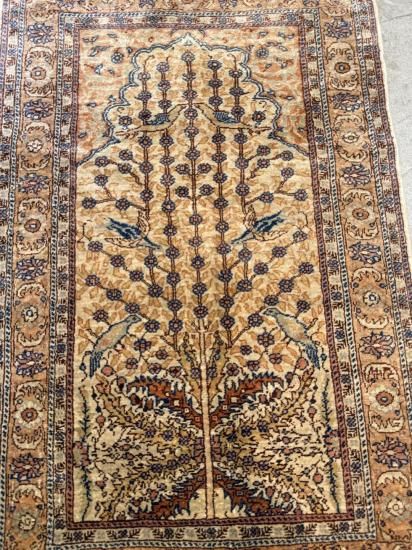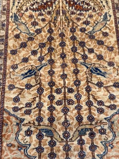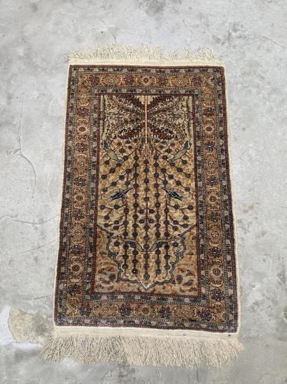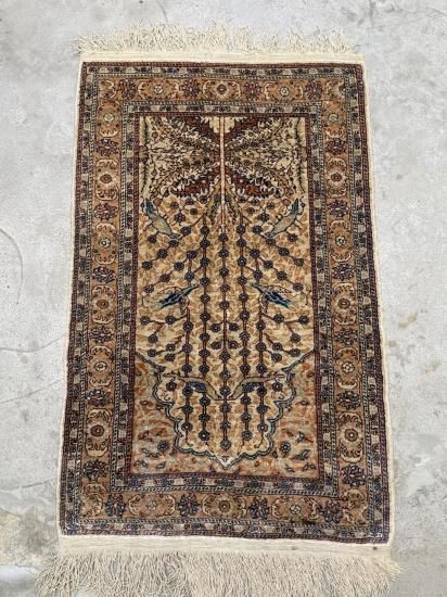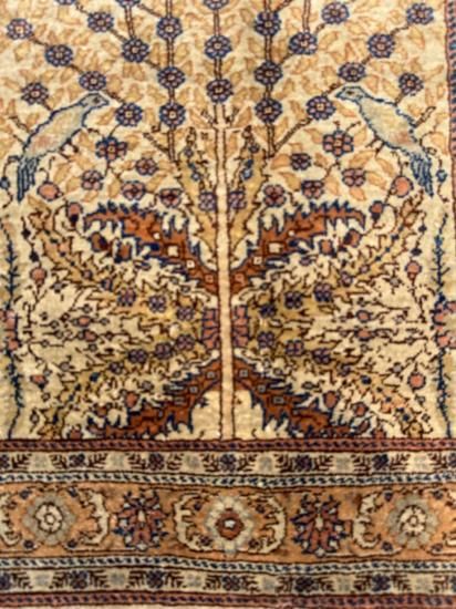【50年物】カイセリ産シルク絨毯(92×60cm)ヴィンテージ/鳥と生命の木文様