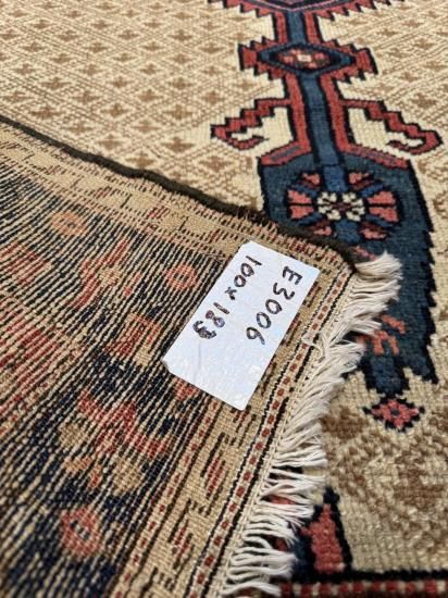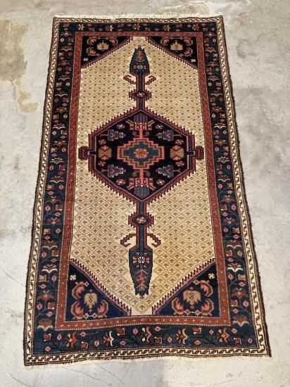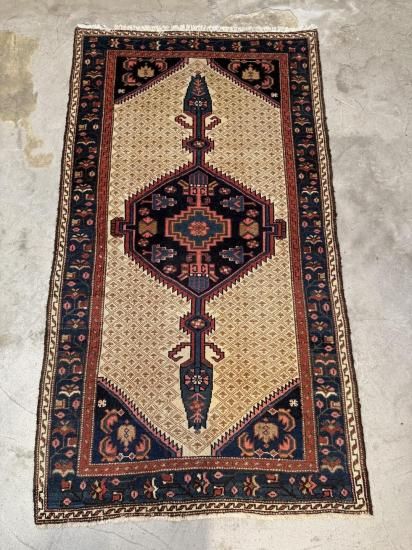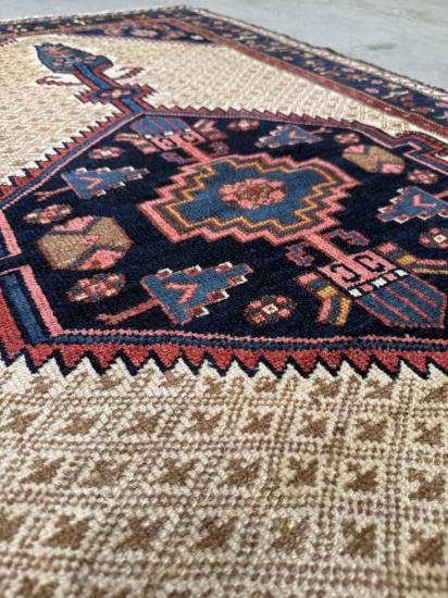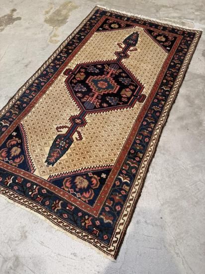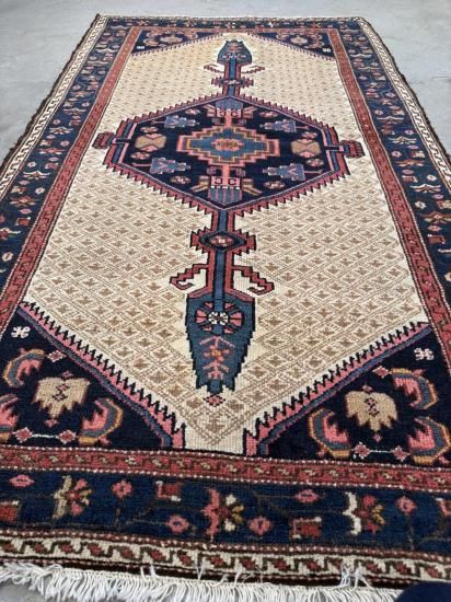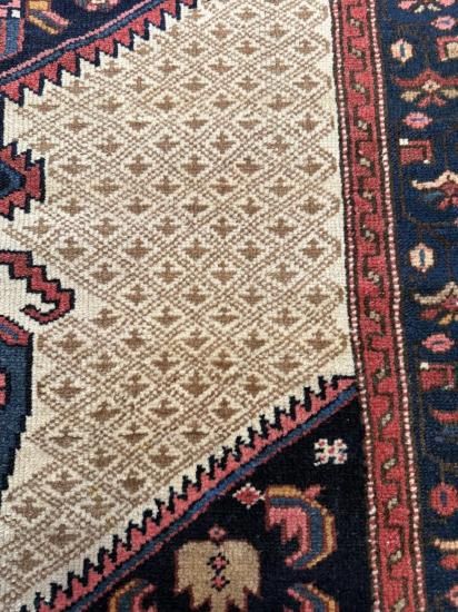 中央に大きな メダリオン(ゴベキ) が配置された伝統的なデザインで、クリーム色のフィールドと濃紺・赤のコントラストが美しい一枚です。